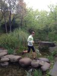 Aus dem Stadtplan suchte ich mir eine Route bei der ich auf einen größeren Park stoßen sollte. In Shanghai wird so schnell gebaut dass man auf den Karten nicht sicher ist ob es den Park schon gibt, oder ob es eine Baustelle ist. Entlang der Straße ging es zuerst ein paar Kilometer auf dem Radweg. Danach kam wirklich ein kleiner Fluß und am Ufer war ein Park mit einer Uferpromenade. Jackpot! Es folgten schöne Kilometer auf Kies oder auf Bretterboden. Kurvig ging es zwischen Bäume und Chinesen hindurch. Die Brücken über kleine Zuflüsse waren Steine mit Abständen dazwischen. Auch kleine Pagoden waren am Weg eingebaut. Dort übte eine Frauengruppe einen Tanz.