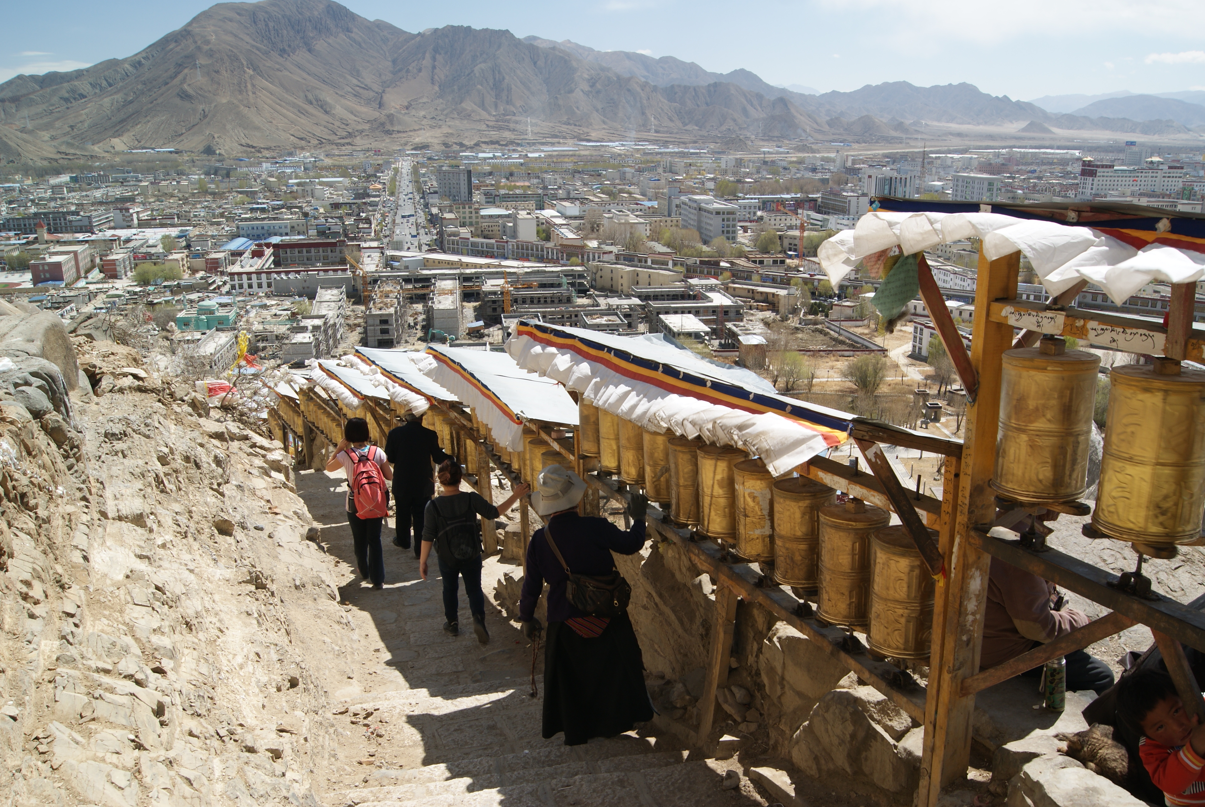 Die Chora in Shigatse dauert ca. 1h wenn man sie geht (ca. 4km). Daher schlug ich TsengDu vor wir laufen mal die Chora. Er war einverstand und schon schlängelten wir uns an den Pilgern vorbei den Weg entlang hinauf hinter dem Kloster. Es wurden fleißig die Gebetsmühlen gedreht und gebetet. Und wzischen drin hüpfen 2 Läufer den Weg entlang. Am höschsten Punkt machten wir Pause und schauten uns die Stadt und das Kloster in der Morgensonne an (es war ca. 8.00). Runter ging es dann über Felsstiegen und kleine Schotterwege. Herrlich!