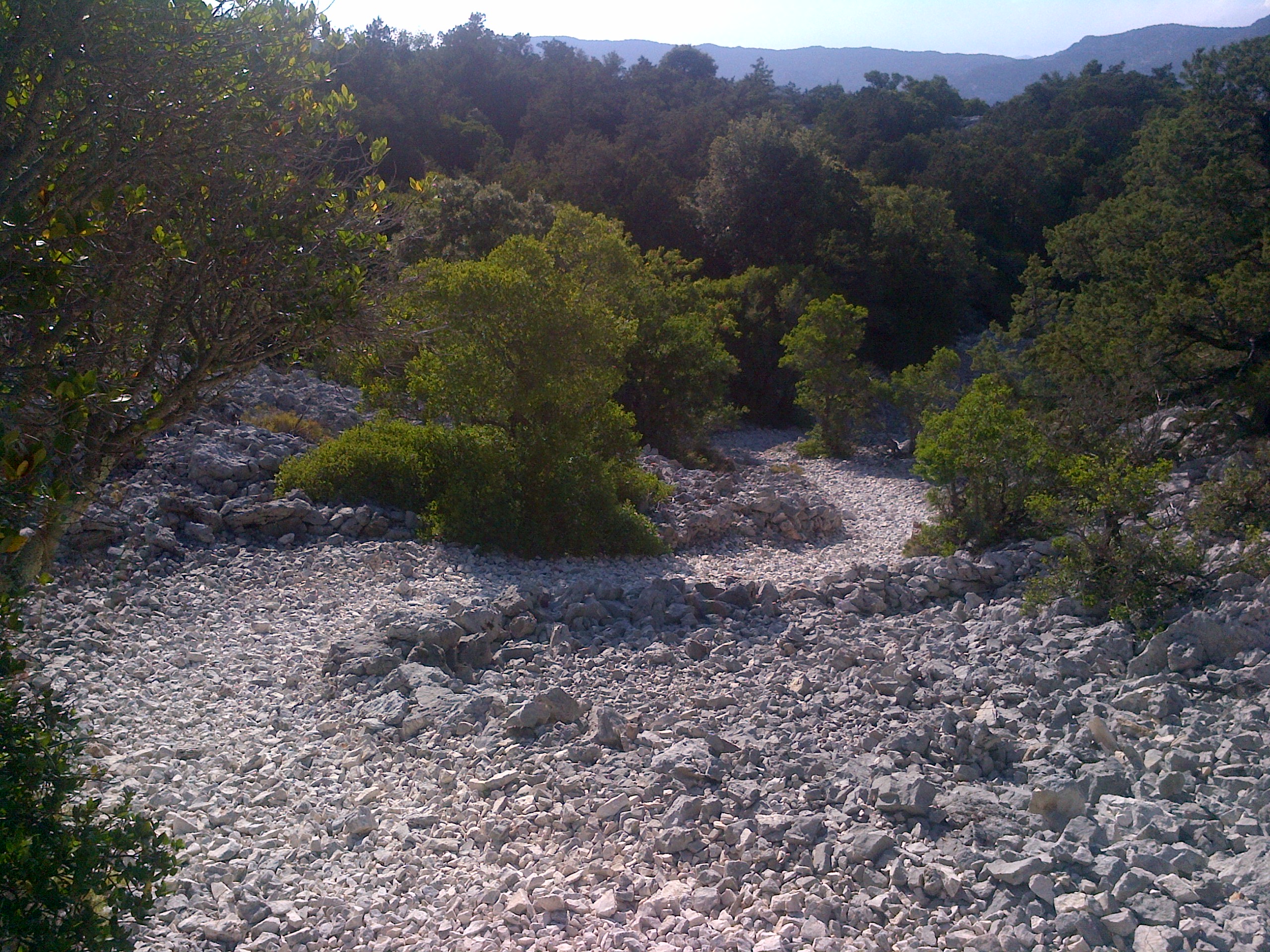 Über sehr grobe Wege geht es über einen langen Downhill runter zur Cala Luna. Keine Menschenseele weit und breit, nur ab und zu scheuche ich durch mein Laufen einige Rehe auf.