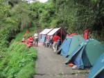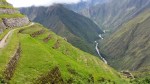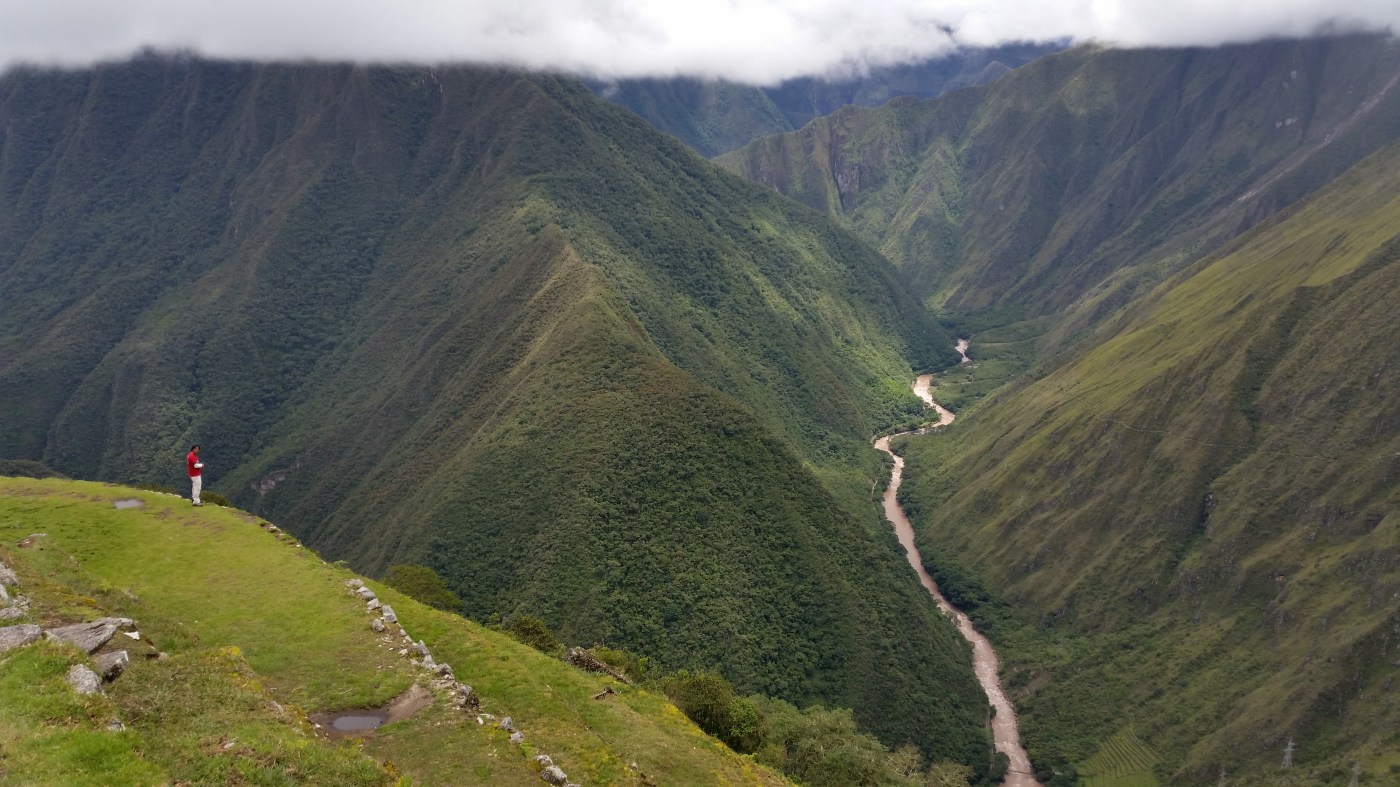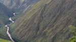 Am nächsten Tag ging es dann die 1000HM hinunter und es wurde tropisch. Unser Zelt hatte am Campingplatz eine Aussicht auf den Rio Vilcanota und die grünen Hänge links und rechts. Mir fiel ein abfallender Trail auf der rechten Seite hinunter zum Fluß auf. Der Guide sagte dass es ein Trail für kürzere Touren ist und gut zu laufen geht. Es sind geschätzte 500HM zuerst hinunter und dann wieder zurück hinauf ins Camp. In Peru. Auf 2500m. eine Tagestour von der nächsten Straße entfernt. No Risk, no fun 🙂 und hinuntergestochen zum Fluß. Am Fluß war bei einer Ranger Station dann der Weg zu Ende. Es war eh an der Zeit wieder an den Aufstieg zu denken. An Wasserfällen und Inka Ruinen vorbei ging es wieder zurück zum Camp.