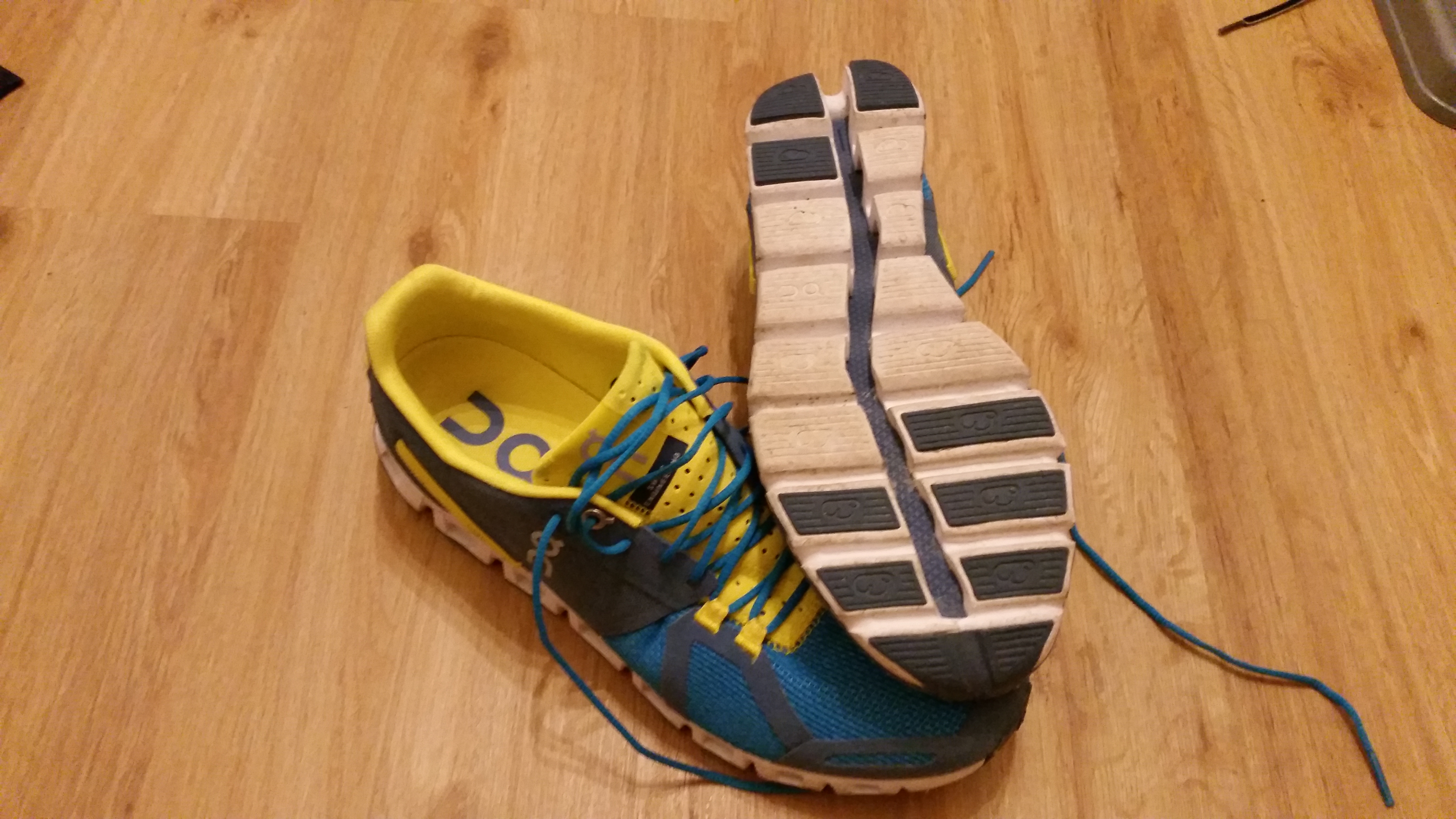 Jetzt probier ich den ON Cloud aus. Ich schlüpfte das erste mal hinein und er passte wie angegossen. Die Gummi-Schnürung kam sofort raus und die normale Schnürung rein. Aber beim ersten Lauf war er immer noch sehr schwammig. Das wichtigste ist aber die Dämpfung. Und die funktioniert top!