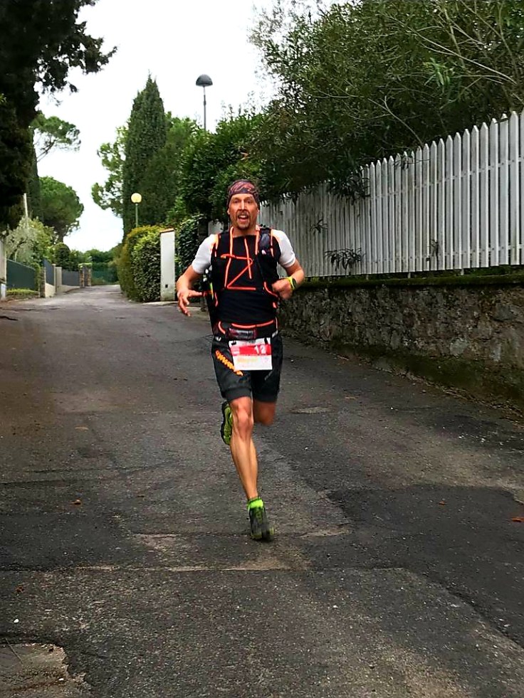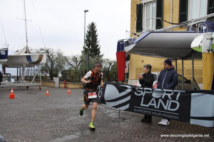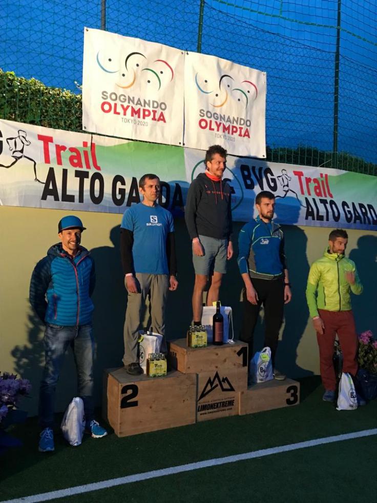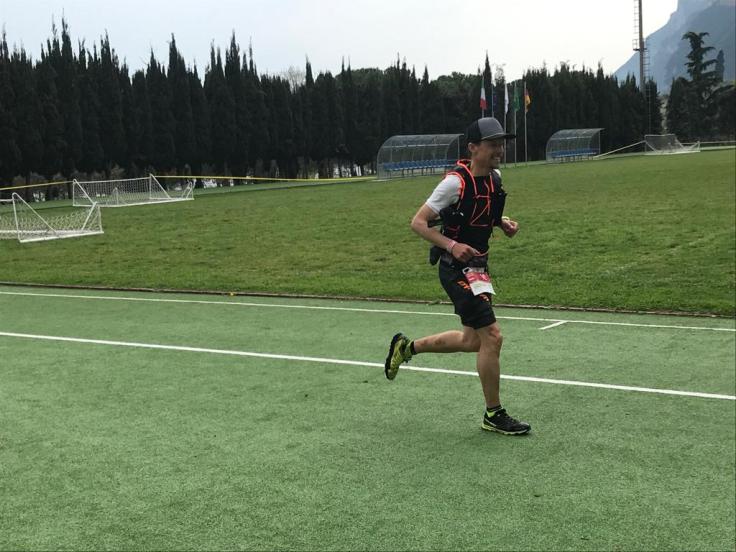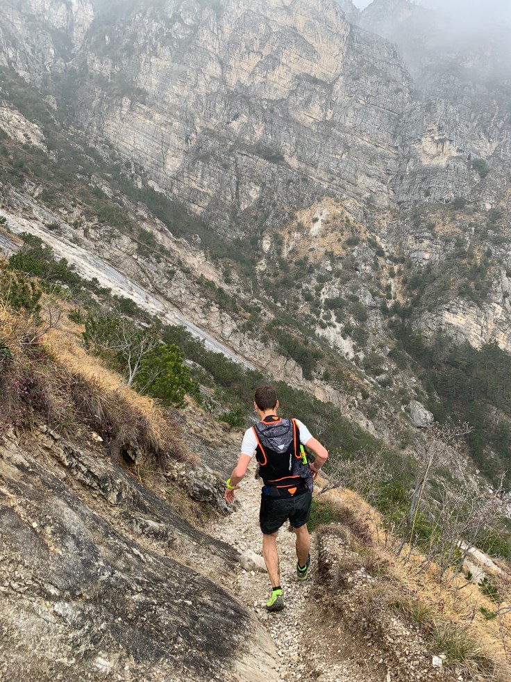 Ich merke beim nächsten Anstieg dass ich schwach unterwegs bin. Es geht nur langsam bergauf. Ich probier aus ob mich ein Podcast ablenkt. Ein bisserl funktioniert es. Dann kam Flo Felch bei km55 angedüst. Locker läuft er den langen Anstieg rauf als wäre es nach 10km. Ich bin fertig! Hoffentlich kommt nicht auch noch bald der nächste! Doch! nur noch 200m hinter mir. Das treibt mich an. Gas geben! im Flachen und bergab. Es ist nur noch der letzte Anstieg hinauf zum Monte Bestone. Beim Anstieg schließt er zu mir auf, aber auch er ist kaputt. Wir haben bereits über 65km in den Beinen und es geht zach voran. Wir batteln uns um Platz 4 und 5. Auf dem höchsten Punkt sehen wir Platz 3. Der ist in Reichweite! Er sieht uns auch! Also runter den Weg 102 nach Limone. Ich löse mich von meinem Mitstreiter. Switchbacks alle 10meter, sausteil, meine Oberschenkel brennen. Nicht langsamer werden, Gas geben! Platz 3 muss bald in Sichtweite kommen! Immer noch nichts! Wir münden in den steilen gepflasterten Weg am Bach ein. Er führt direkt nach Limone. Ich kenne die spitzen Steine genau, denen ich meine blauen Zehennägel verdanke! Immer noch nix! Im Ziel erzählt mir dann Saverio (3. Platz) er hatte die gleichen Gedanken. Er ist auf Teufel komm raus hinuntergeballert, da er wußte ich liege ihm im Nacken.