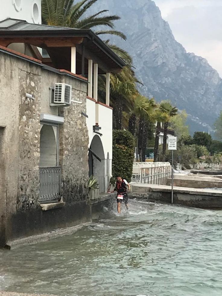 Am Strand, 500m vor dem Ziel, empfängt mich Lisa. Sie lotst mich gleich mal ins Wasser. Und wirklich, kurz vor dem Ziel geht die Strecke 200m durch den Gardasee!